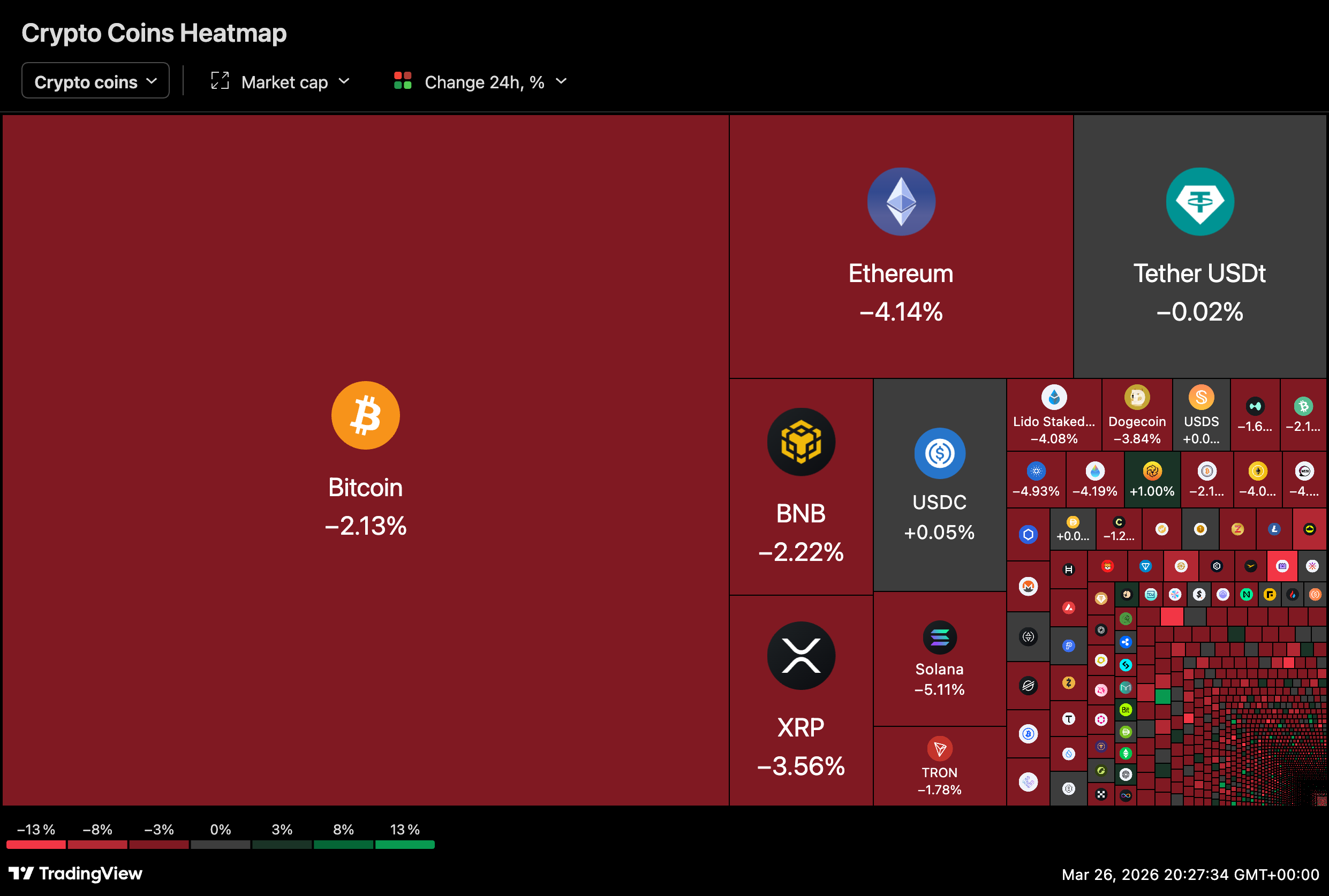 Market heatmaps showed widespread losses across major cryptocurrencies, with Ethereum down 4.1% and Solana falling over 5%. Bitcoin, the largest asset by market cap, posted a more modest 2.1% decline but remained firmly in negative territory.