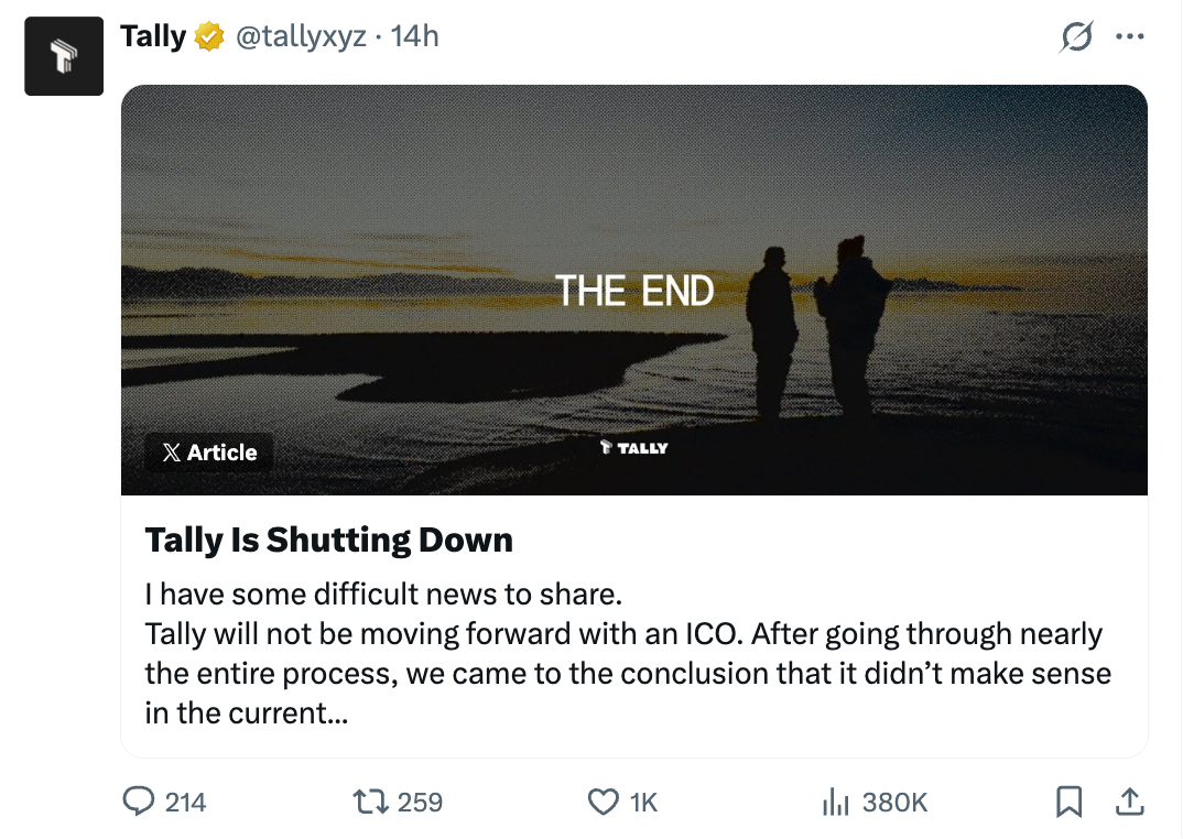 Last night, a shocking announcement shook the DAO governance space: Tally, the platform providing core governance infrastructure such as on-chain voting and delegation to over 500 leading DAOs including Uniswap, Arbitrum, and ENS, announced it will officially shut down after nearly six years of operation.