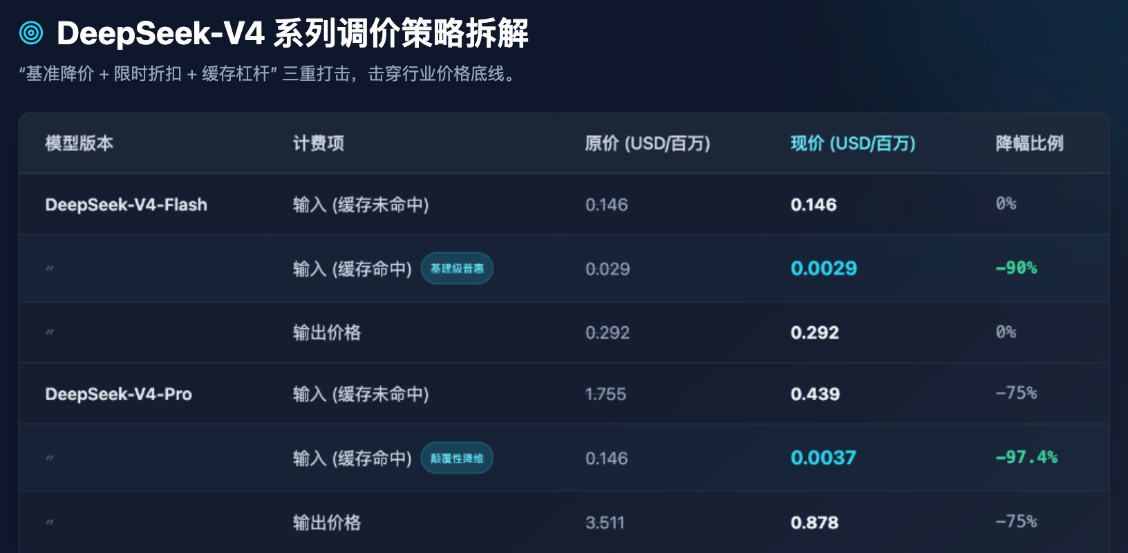 According to the latest published data, DeepSeek has implemented a three-pronged strategy of baseline price reduction, time-limited discounts, and cached leverage.