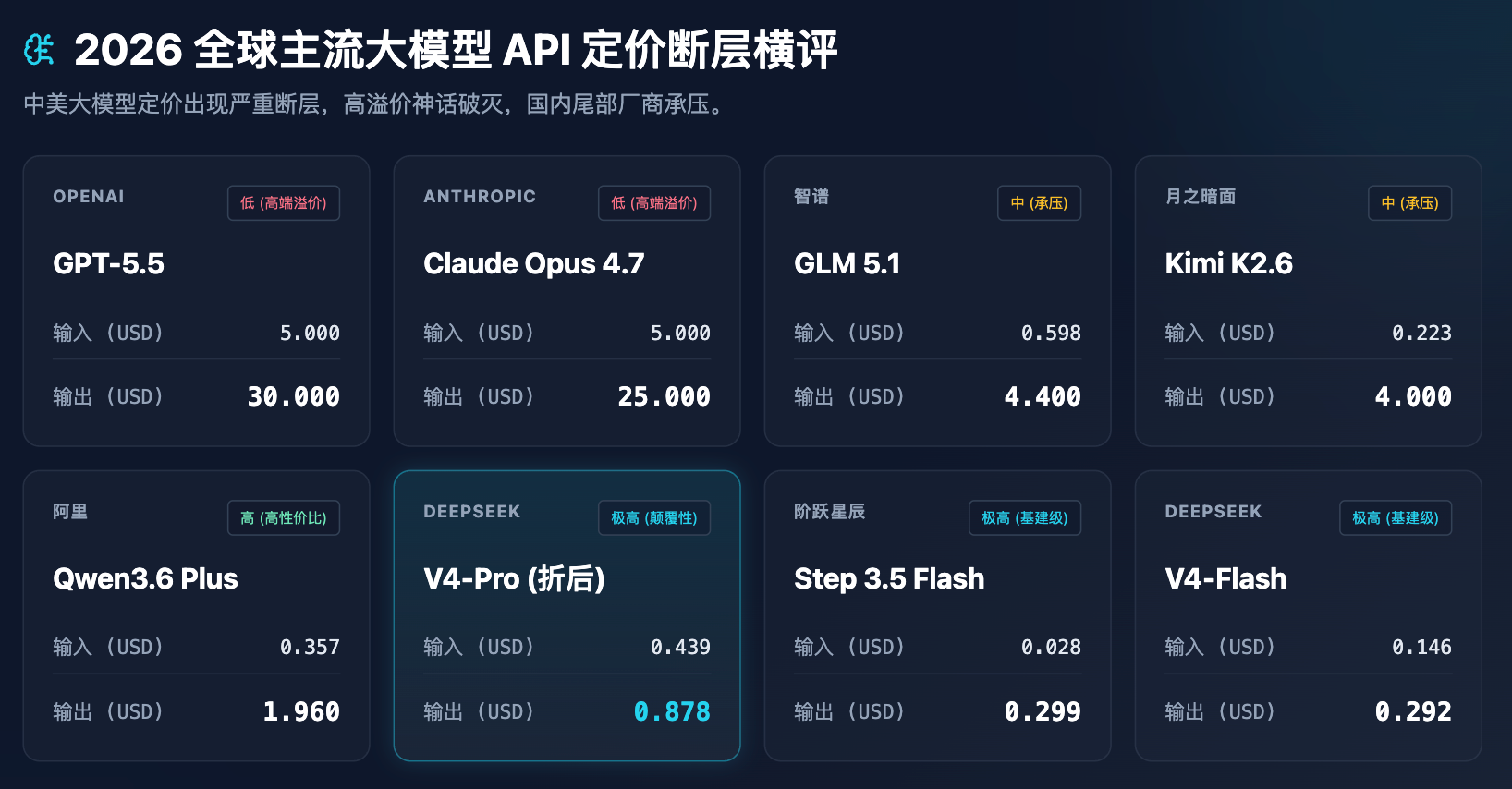 Over the past two years of AI narratives, OpenAI and Anthropic have maintained an unspoken agreement: the most intelligent models deserve the highest gross margins. Currently, the output prices for GPT-5.5 and Claude Opus 4.7 stand at $30 and $25 per million tokens, respectively. These two Silicon Valley giants are attempting to maintain their high compute taxes by monopolizing the most advanced reasoning capabilities.