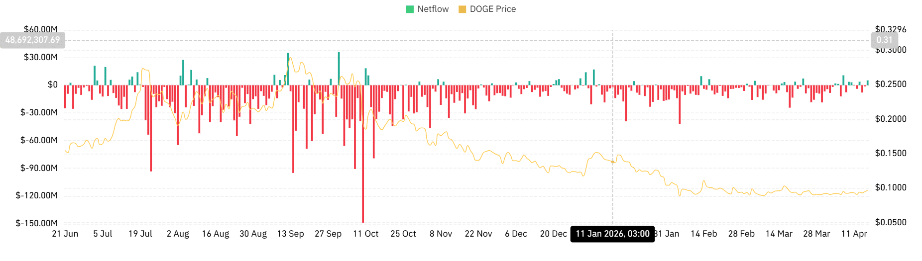 Looking at the exchange flows, the memecoin saw increased deposits after touching $0.097. Dogecoin’s Spot inflow rose to $97.56 million, while withdrawals dropped to $93.36 million.