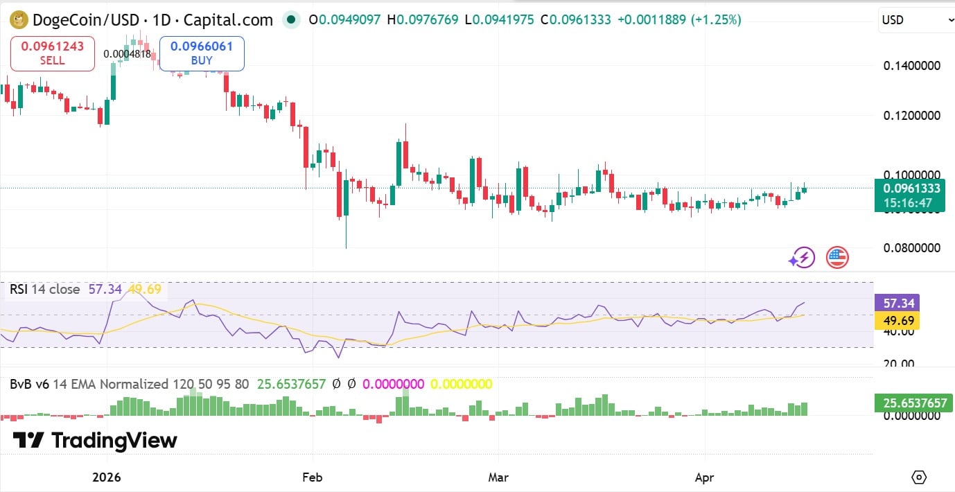 - DOGE rose 4.8%, touching a three-week high of $0.097 before a slight retracement.