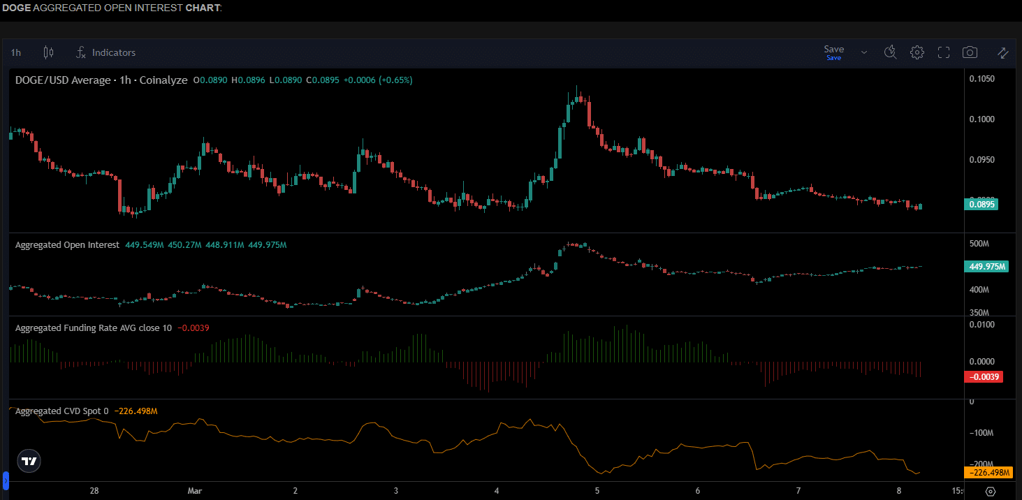 Dogecoin was down 1.24% in the past 24 hours, according to CoinMarketCap, but the Open Interest has increased by 4.6%.