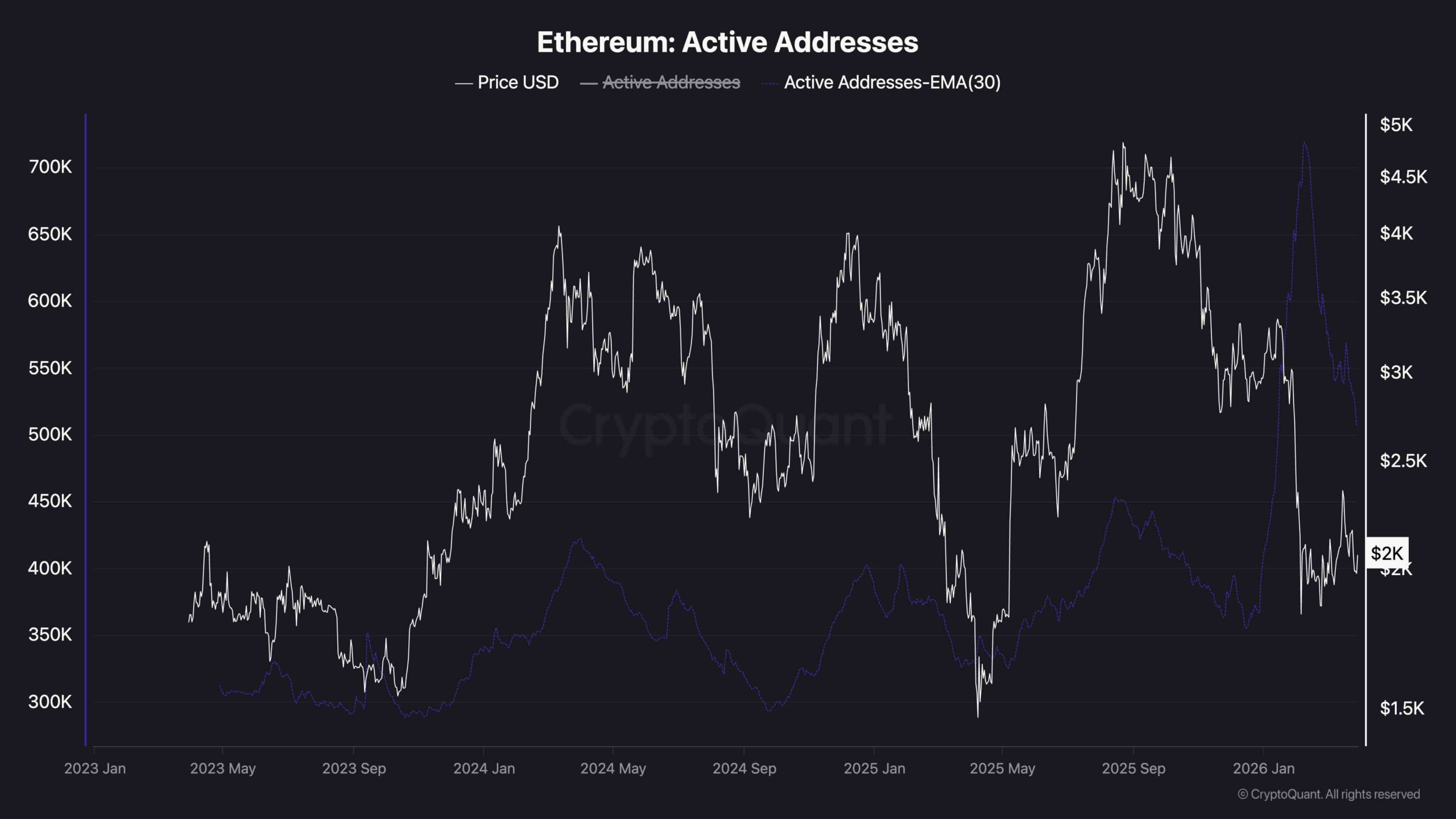 Ethereum’s active address count showed a notable spike during the February crash and around the subsequent lows, significantly surging above levels seen during the last two years. While that kind of activity burst can appear constructive at first glance, the context suggests it was more likely a capitulation event, which is a rush of panicked selling and liquidations rather than a wave of fresh demand entering the market.