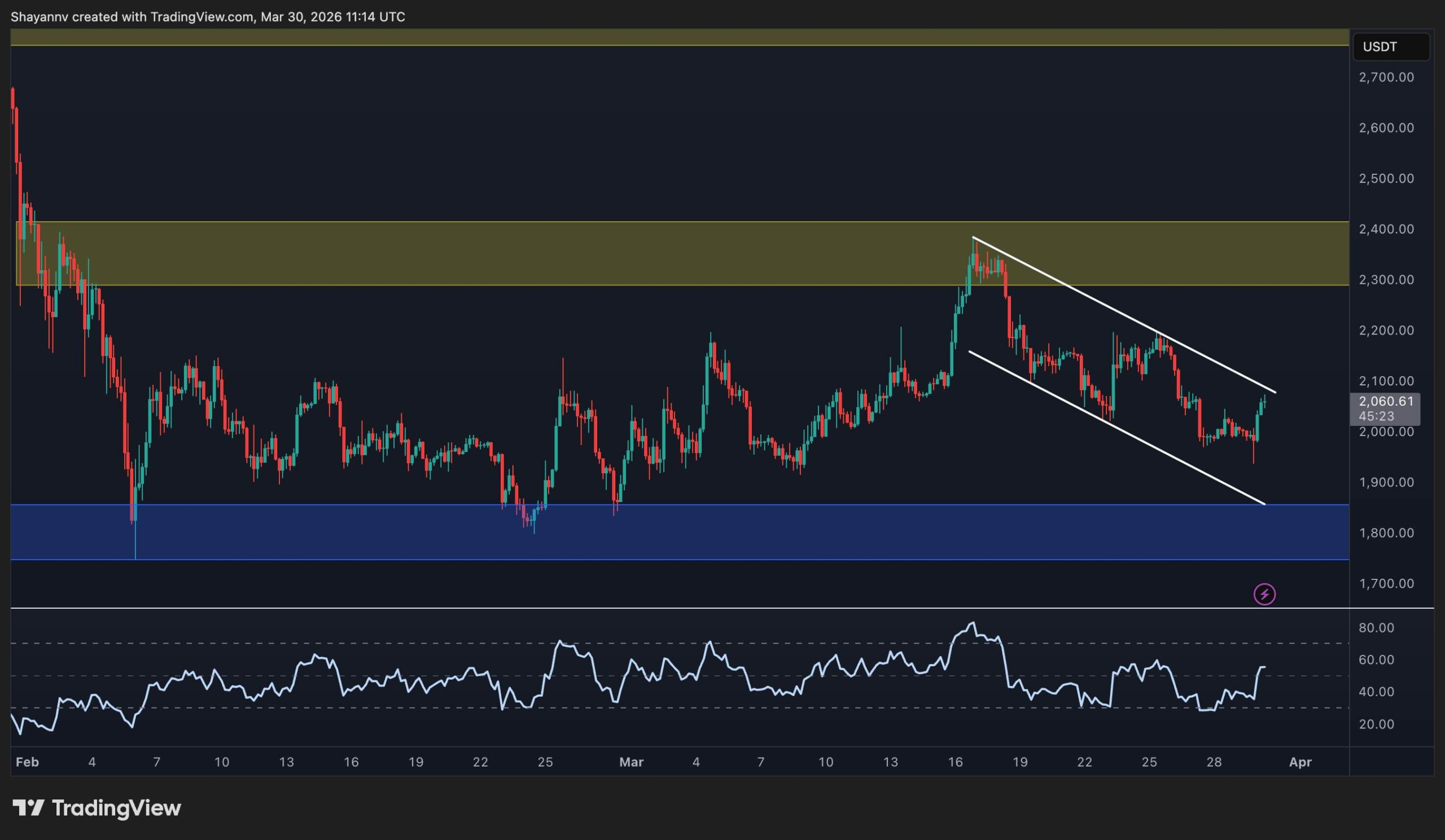 The $2.3k–$2.4k supply zone has proven particularly stubborn, as the price pushed into it in mid-March but was rejected sharply. The $1.8k support level also held earlier during the February capitulation wick and remains the key line in the sand to the downside. The $1.6k and $1.4k levels are the next areas of consequence if the $1.8k support zone breaks.