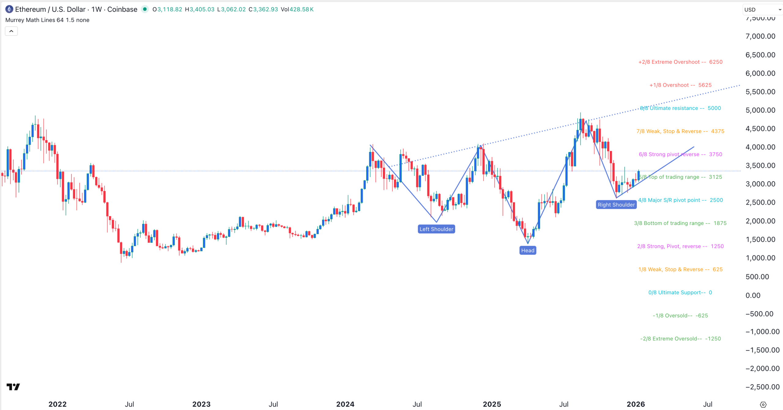 The weekly chart shows that Ethereum price has bounced back after falling to the key support level at $2,661 in November last year. This price was notable as it coincided with the Major S&R Pivot Point of the Murrey Math Lines tool.
