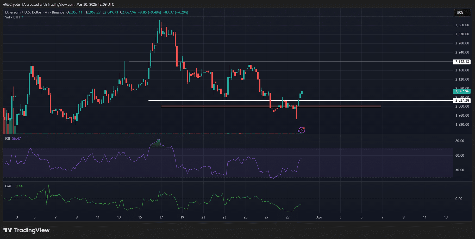 Ethereum’s [ETH] price moved above the $2,000-level following the weekend, highlighting a shift from selling pressure into early recovery. At the time of writing, the altcoin was trading near $2,060, reclaiming the $2,027 support zone after briefly breaking below it.