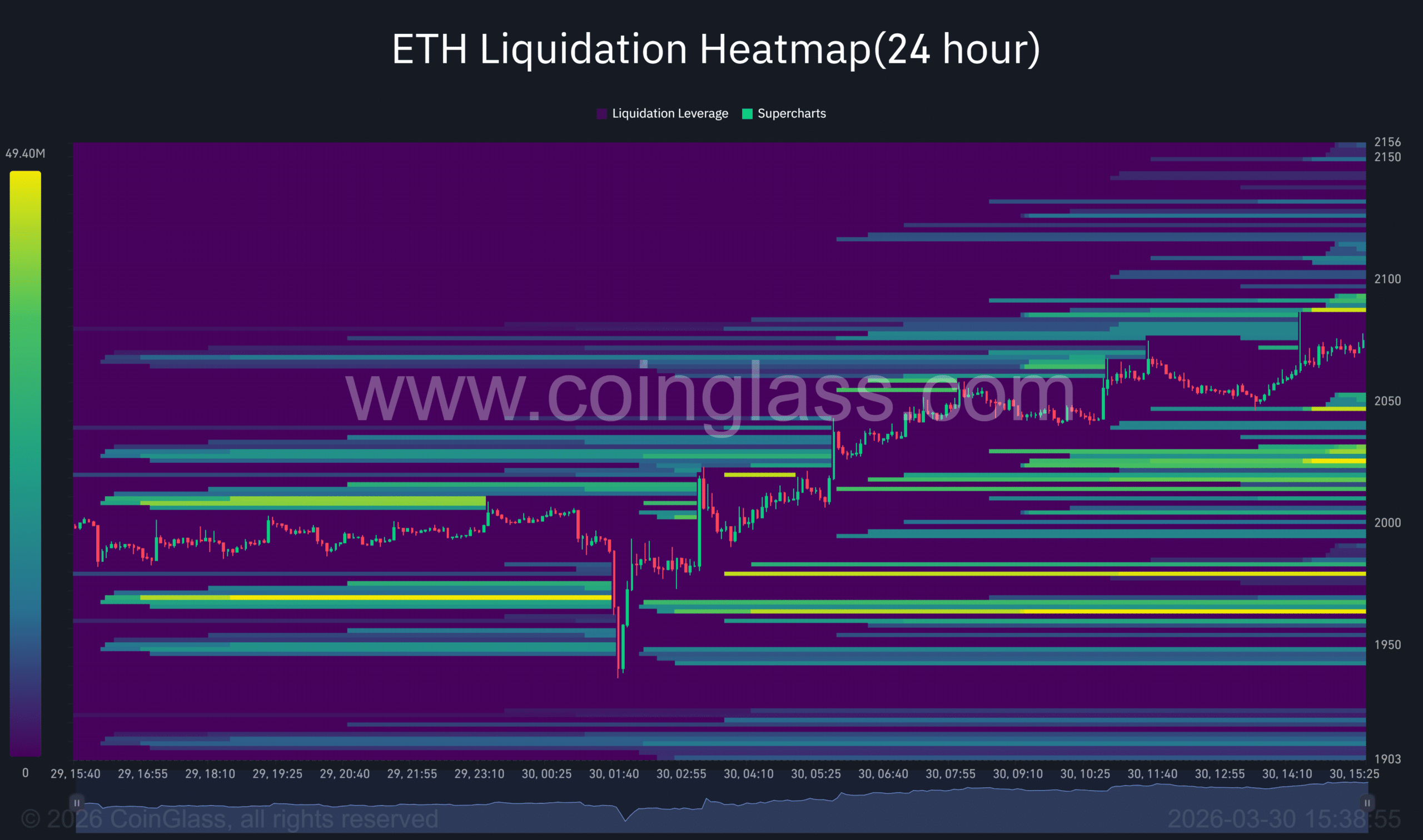 With the price stabilizing above this level, ETH might move towards the $2,100–$2,150 range – Its prior resistance range. This push would happen partly because short positions that entered below $2,000 are now closing, adding upward pressure.