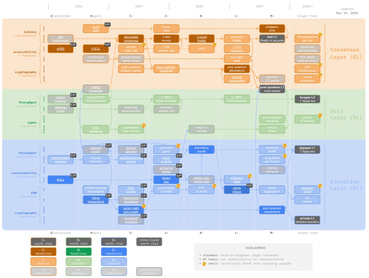 “Strawmap,” a portmanteau of “strawman” draft and “roadmap,” was introduced by Ethereum Foundation researcher Justin Drake in February 2026. It outlines approximately seven network upgrades (roughly every six months) through 2029, transitioning Ethereum from its experimental phase into what the foundation calls the “engineering era,” characterized by predictable, industrial-grade software delivery cycles akin to those of iOS or Android.