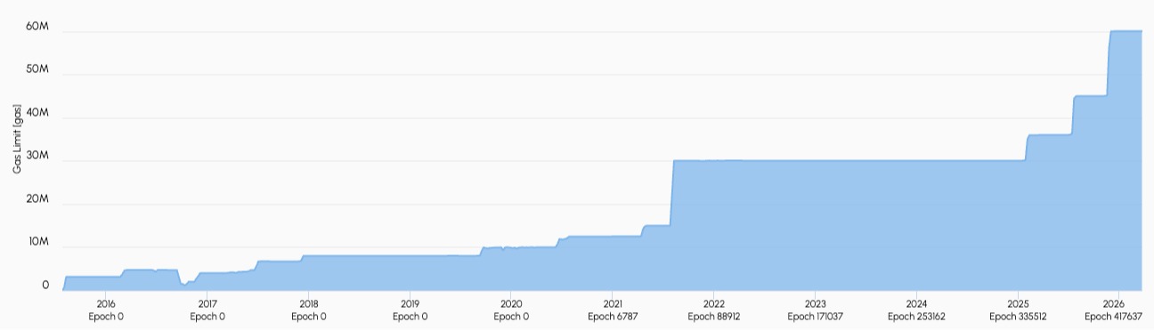 Phase 1: Parallelization and Gas Cap Expansion (2026). In 2025, Ethereum’s block gas limit doubled from 30 million to 60 million, tripling network throughput. This 60-million-gas cap was determined through extensive benchmarking while maintaining a small chain size to enable independent node operators to verify and download the chain. Currently, Ethereum processes transactions sequentially—one at a time. The EIP-7928 (Block-Level Access Lists), to be introduced in the Glamsterdam upgrade, requires transactions to pre-declare which state elements they will access. This allows execution clients to safely assign non-conflicting transactions simultaneously to multiple CPU cores, transforming Ethereum from a single-lane road into a multi-lane highway. Combined with EIP-7732 (Built-in Proposer-Builder Separation, which decouples block building from consensus and extends validators’ processing window from ~2 seconds to ~9 seconds), the network can safely utilize a larger proportion of each 12-second block time for computation.