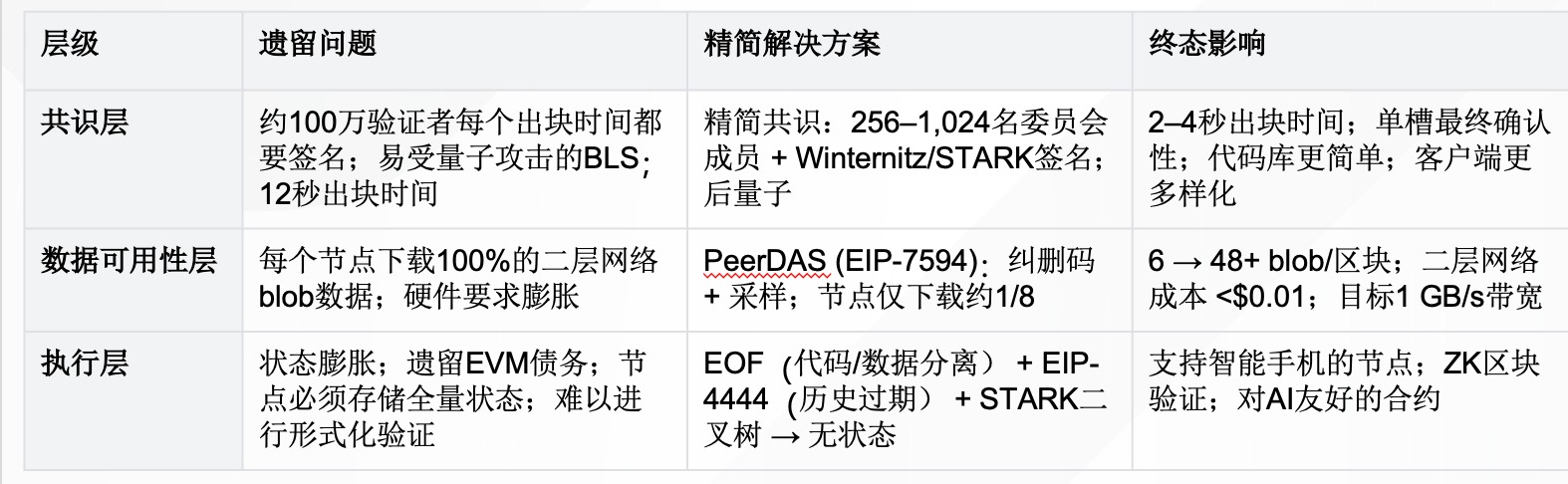 Strawmap’s upgrades are not random feature releases—they are deliberate steps toward building an extremely simplified final architecture. This “lean” philosophy is uniformly applied across three layers of the Ethereum tech stack: the consensus layer, the data availability layer, and the execution layer. In each case, the core principle is the same: leverage advanced cryptography (ZK proofs, erasure coding, data sampling) to shift heavy computational burdens off individual nodes, enabling exponential network scaling while keeping the base layer light enough to run on consumer-grade hardware. Think of Strawmap as a construction schedule, and these three lean initiatives as the blueprints for the finished building.