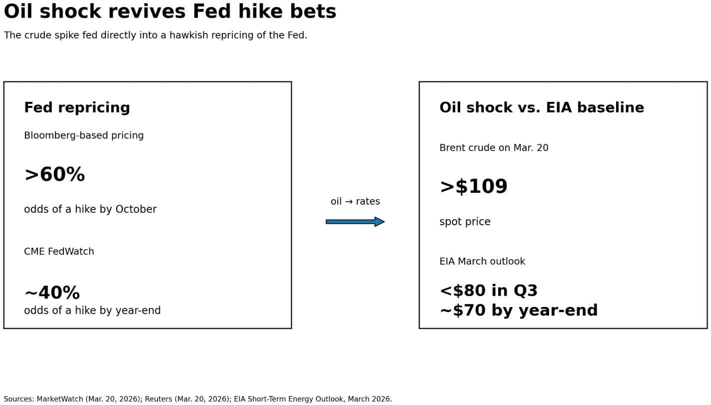 The bull case rests on the EIA baseline holding. If oil retraces faster than feared, labor softens into the Apr. 3 jobs report, and the February PCE data on Apr. 9 show no second-round effects bleeding into core, hike odds could deflate as quickly as they inflated.