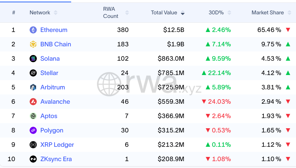 According to the latest statistics from RWA.xyz, the total value locked (TVL) in tokenized assets on the Ethereum blockchain has reached $12.5 billion, accounting for 65.5% of the market share, significantly surpassing BNB Chain's $2 billion, and less than $1 billion each for Solana and Arbitrum. Wall Street giants such as BlackRock and JPMorgan have already launched tokenized U.S. Treasury bonds, private loans, and fund products on the blockchain in large scale. The RWA market is expected to grow by over 212% by 2025, reaching a total size of more than $12.5 billion. Institutional surveys also show that 76% of asset management companies plan to invest in tokenized assets before 2026.