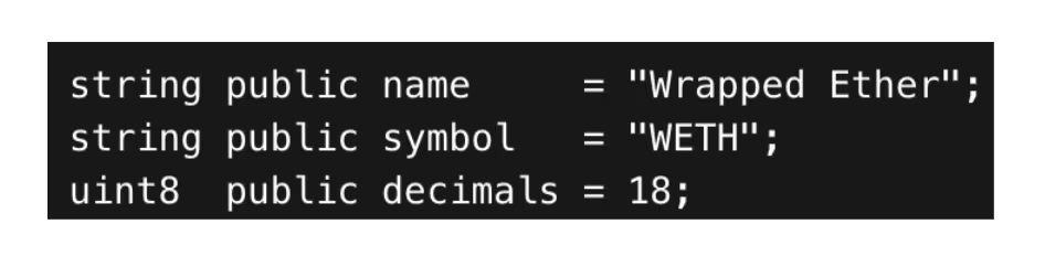 Token authenticity and metadata are the same issue. Tokens appear to self-describe, but token metadata is not authoritative—it is merely byte data returned by the code. A classic example is Wrapped Ether (WETH). The widely used WETH contract code explicitly defines the name, symbol, and decimals.