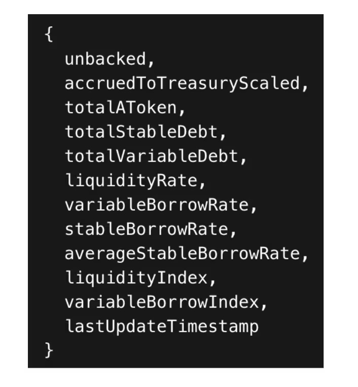 This method returns a structure containing the total liquidity, interest rate index, and configuration flags with a single call, for example: