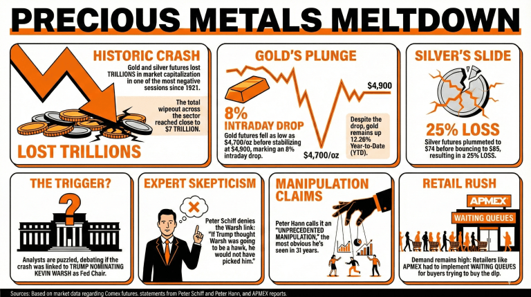 Some analysts suggest the selloff may be linked to the announcement of Kevin Warsh as Trump’s nominee for Fed Chairman, but others believe it could be market manipulation.Is there still demand for precious metals despite the price drop?
