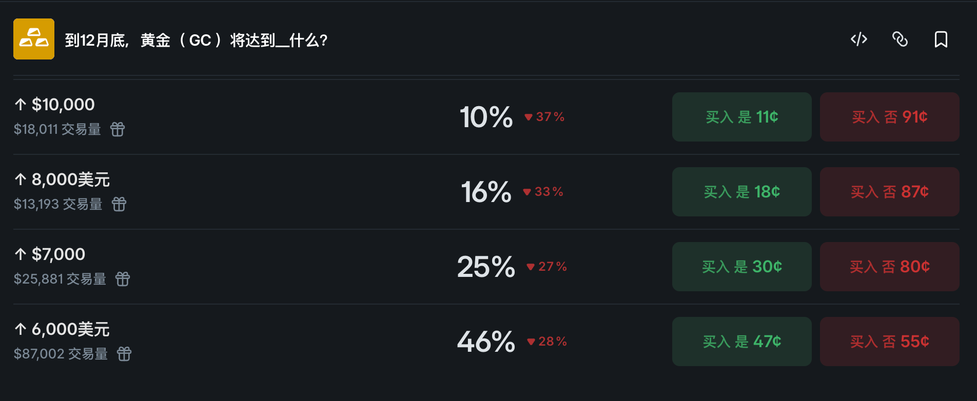 The total amount wagered on the mid-year gold price prediction on Polymarket currently exceeds $3.5 million, including: