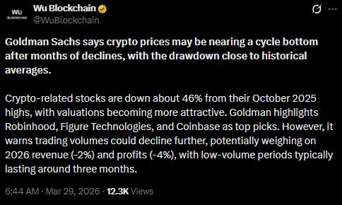 The post Goldman Sachs: Crypto Nearing Cycle Bottom After 46% Stock Drop appeared first on The Market Periodical.