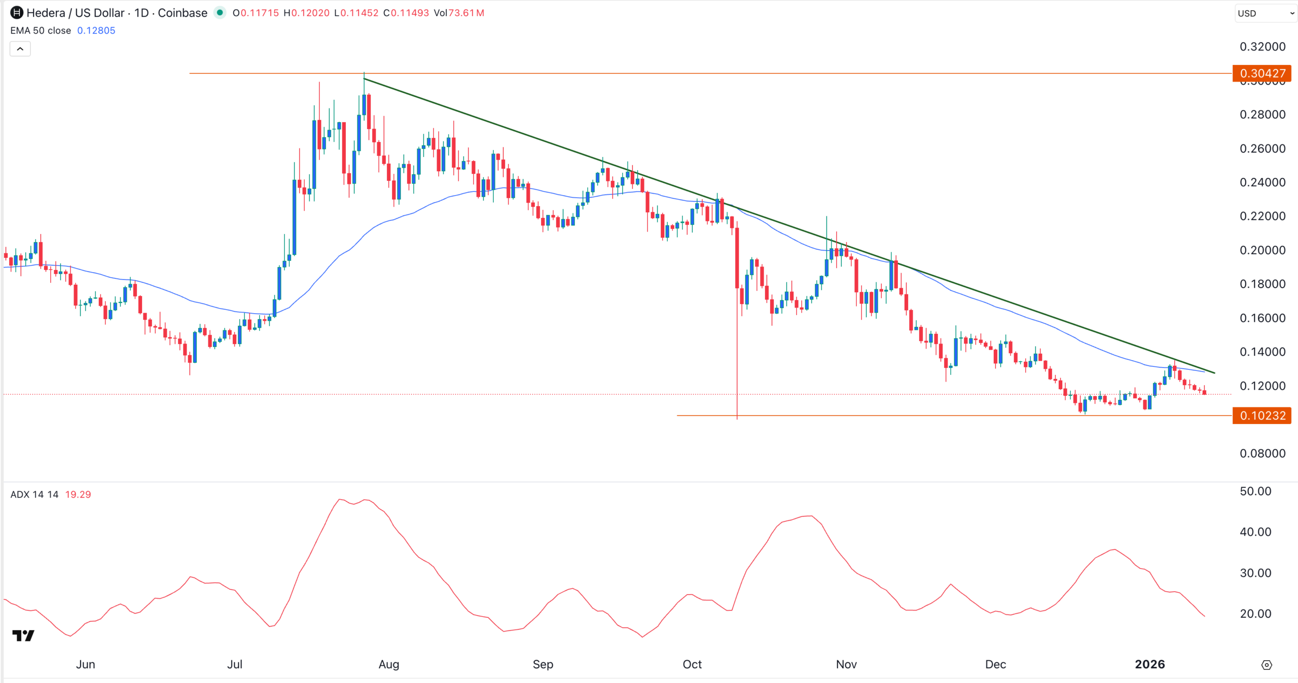 Hedera price also remains below all moving averages. In particular, it has resisted moving above the 50-day Exponential Moving Average (EMA) since October last year.