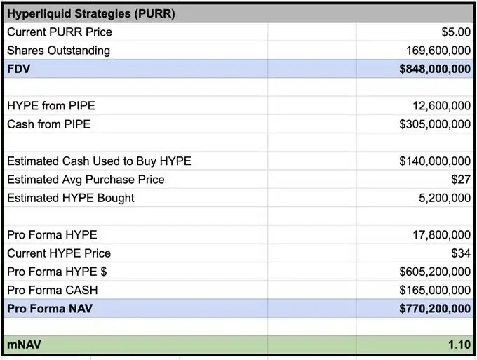 According to @Keisan_crypto's calculation, the current mNAV of PURR is approximately 1.10, which means that they already have the conditions to issue new shares if they wish.