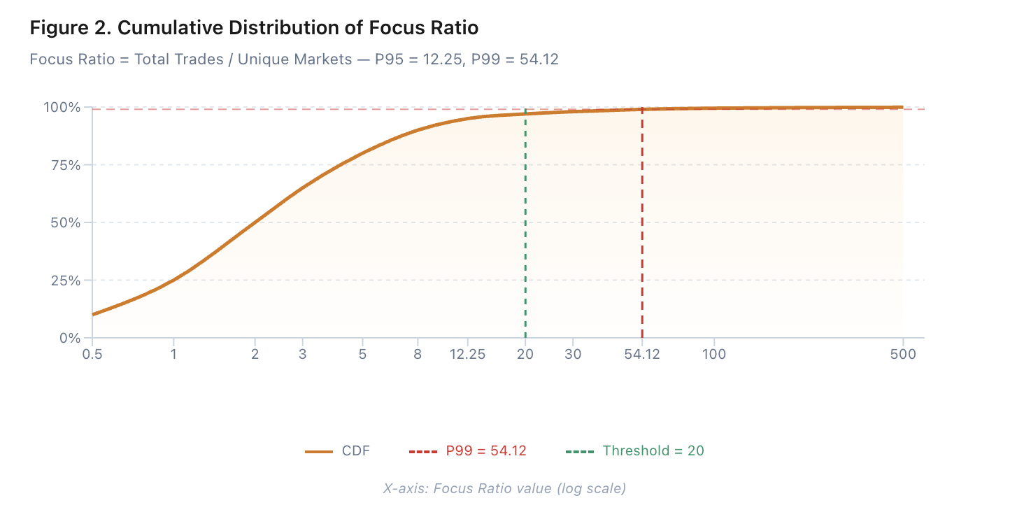 For real users, the number of markets participated in and the total number of transactions exhibit a positive logarithmic-linear relationship. As the number of studied markets increases, the number of transactions increases moderately. Focus Ratio( Total number of transactions / Number of markets participated ) has always been maintained at 2~10 in English (United States) is "2 to 10". reasonable range.