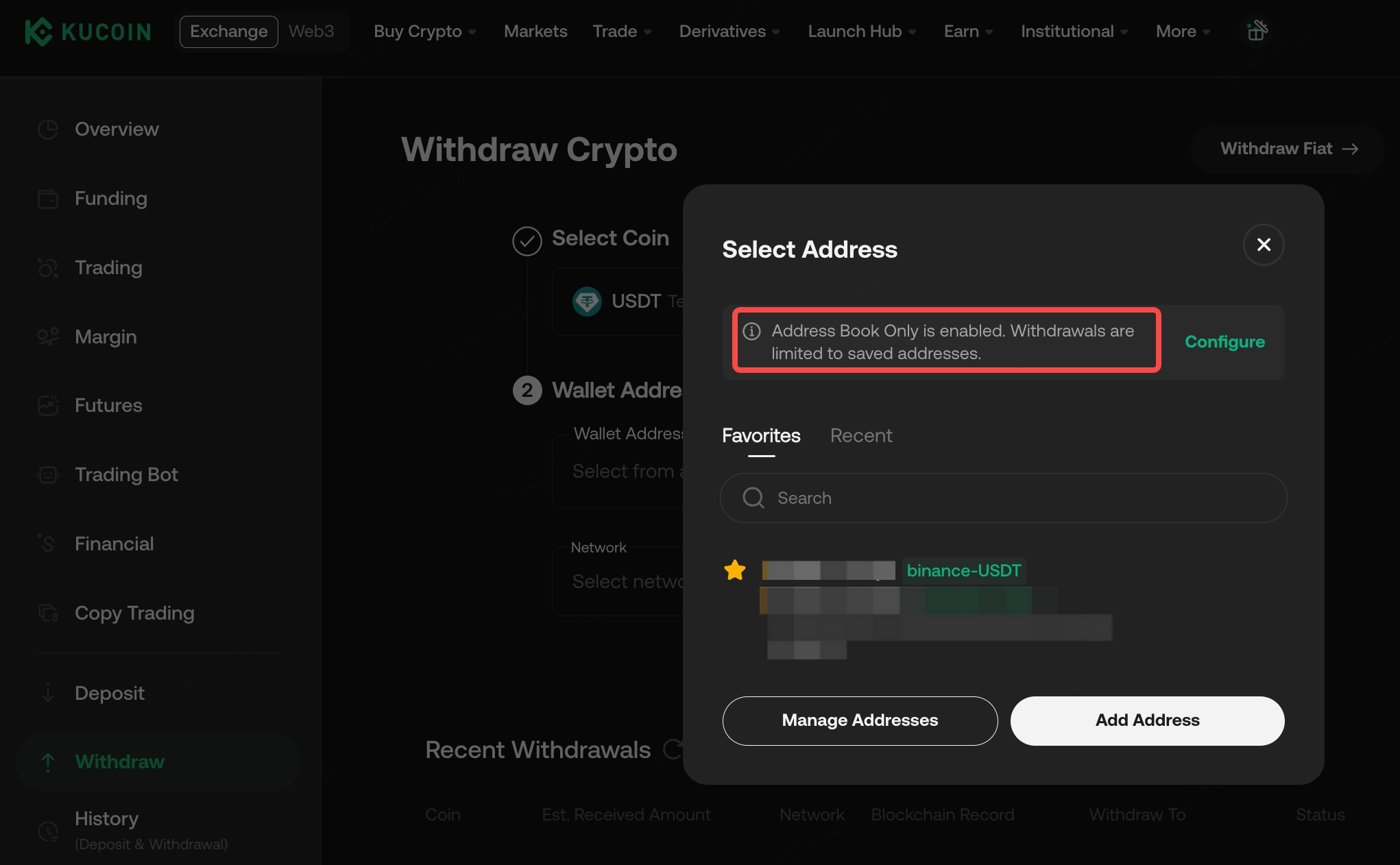 select from your saved addresses during withdrawal- Enable Whitelist Feature: Some exchanges and advanced wallets offer a "withdrawal address whitelist" feature. The first withdrawal to a new address requires multi-factor verification. Subsequently, you can only send to addresses on the whitelist, fundamentally preventing transfers to new, unauthorized addresses.