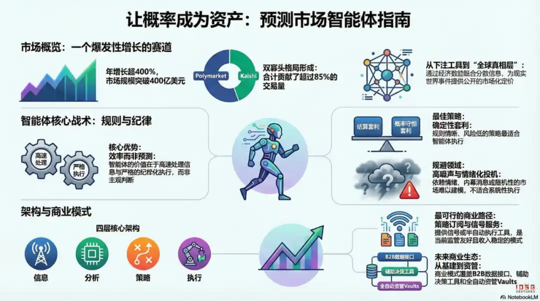 1. Market Foundation and Evolution: Polymarket and Kalshi have established a duopoly, providing sufficient liquidity and scenario foundations for agents built around them. The core distinction between prediction markets and gambling lies in positive externalities—aggregating dispersed information through genuine trading to publicly price real-world events, gradually evolving into a “global truth layer.”