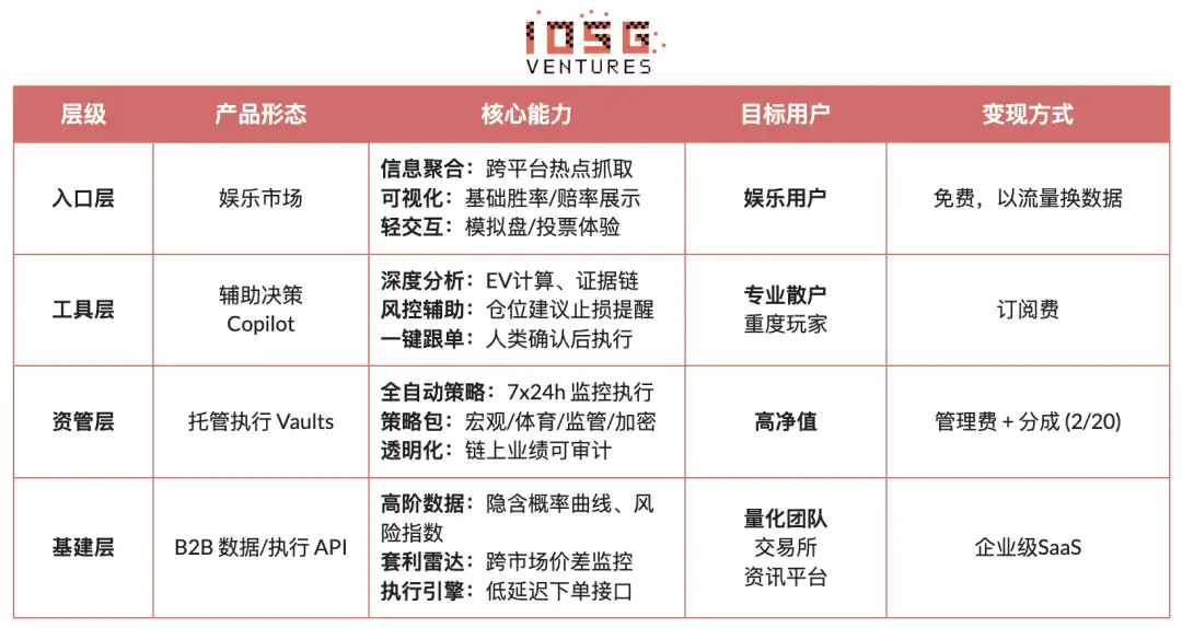 · Infrastructure layer, providing multi-source real-time data aggregation, Smart Money address database, unified prediction market execution engine, and backtesting tools, generating stable revenue through B2B fees unrelated to prediction accuracy;