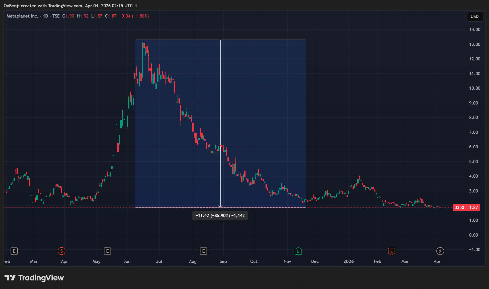 It’s unclear whether Metaplanet, the world’s third-largest BTC treasury firm, will convince JPX to drop its strict rules. The firm’s Tokyo Stock Exchange-listed stock (3350) closed the session on the 3rd of April at $1.87. It was down 86% from the 2025 highs of $13.3.