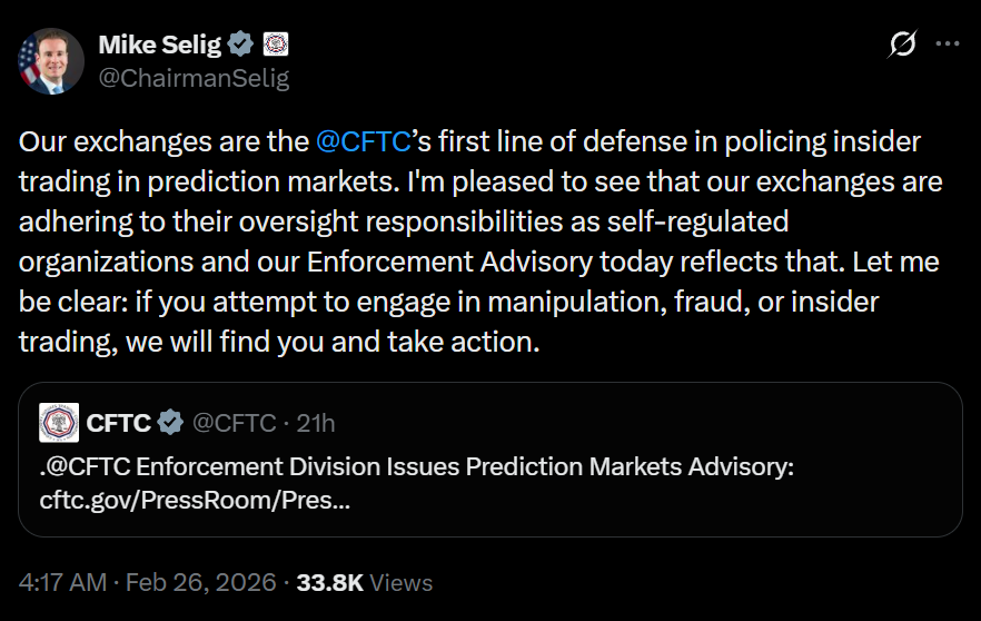 The fines on these two notices are not substantial, but their signaling value far exceeds the monetary amounts. On the same day, the CFTC issued an official enforcement advisory, explicitly citing Section 6(c)(1) of the Commodity Exchange Act, stating that both cases may constitute federal violations. CFTC Chair Mike Selig stated on X: "Our exchanges are the CFTC’s first line of defense against insider trading in prediction markets. If you attempt to manipulate, defraud, or engage in insider trading, we will find you and take action." This marks the first time a U.S. federal regulatory agency has issued such a direct warning against insider trading in prediction markets.