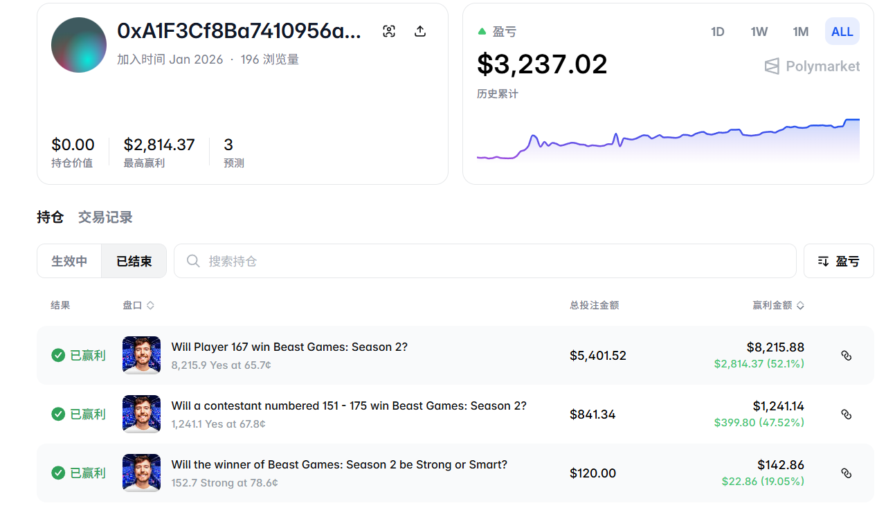 Among these 16 addresses, the most suspicious one, named "0xA1F3Cf8Ba7410956a2955D5300A9be7Ff1dBc07E-1767992471439," participated in only three Beast Games sub-markets, all of which were profitable, resulting in a 100% win rate and a total profit of $3,237. Several similar addresses exhibit comparable behavior—while individual profits are modest, their operational patterns are highly consistent. This suggests that insider traders may be deliberately dispersing their bets to reduce scrutiny.