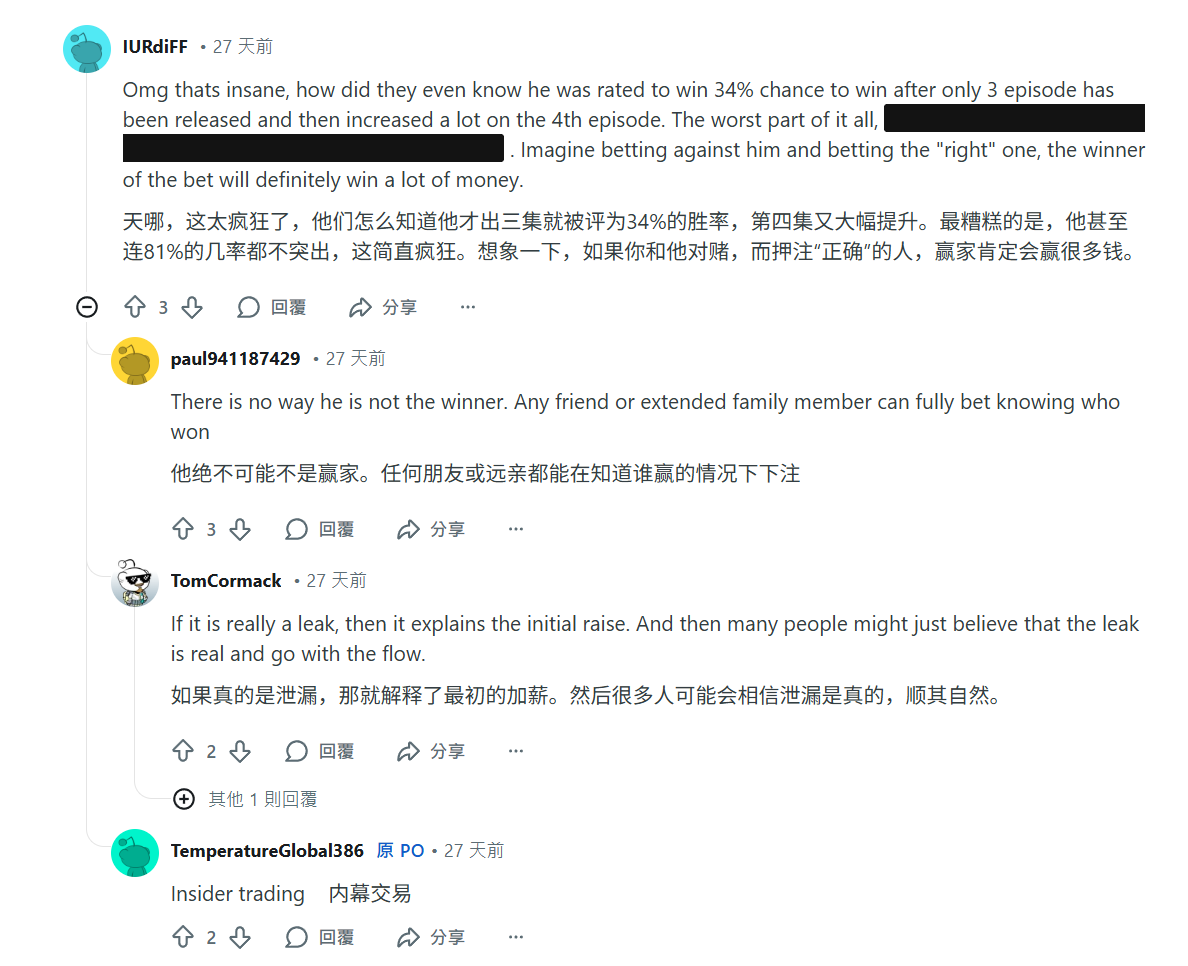 The Reddit community and Polymarket comment sections have already exploded. Multiple posts directly state in their titles that “the winner has basically been spoiled by Polymarket.” Community members have drawn comparisons to the first season’s winner, Jeff Allen, whose victory was also leaked in advance—but this time, the data patterns are even more blatant.