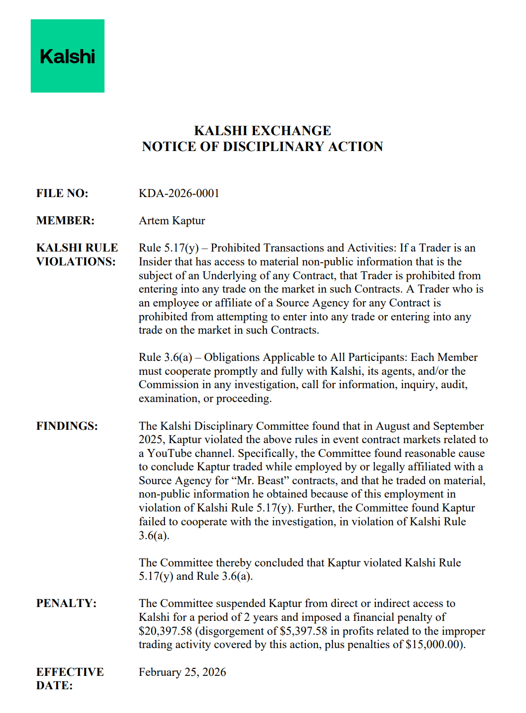 According to Kalshi’s disciplinary notice, Kaptur traded event contracts related to the MrBeast channel during August to September 2025, using his position at Beast Industries.