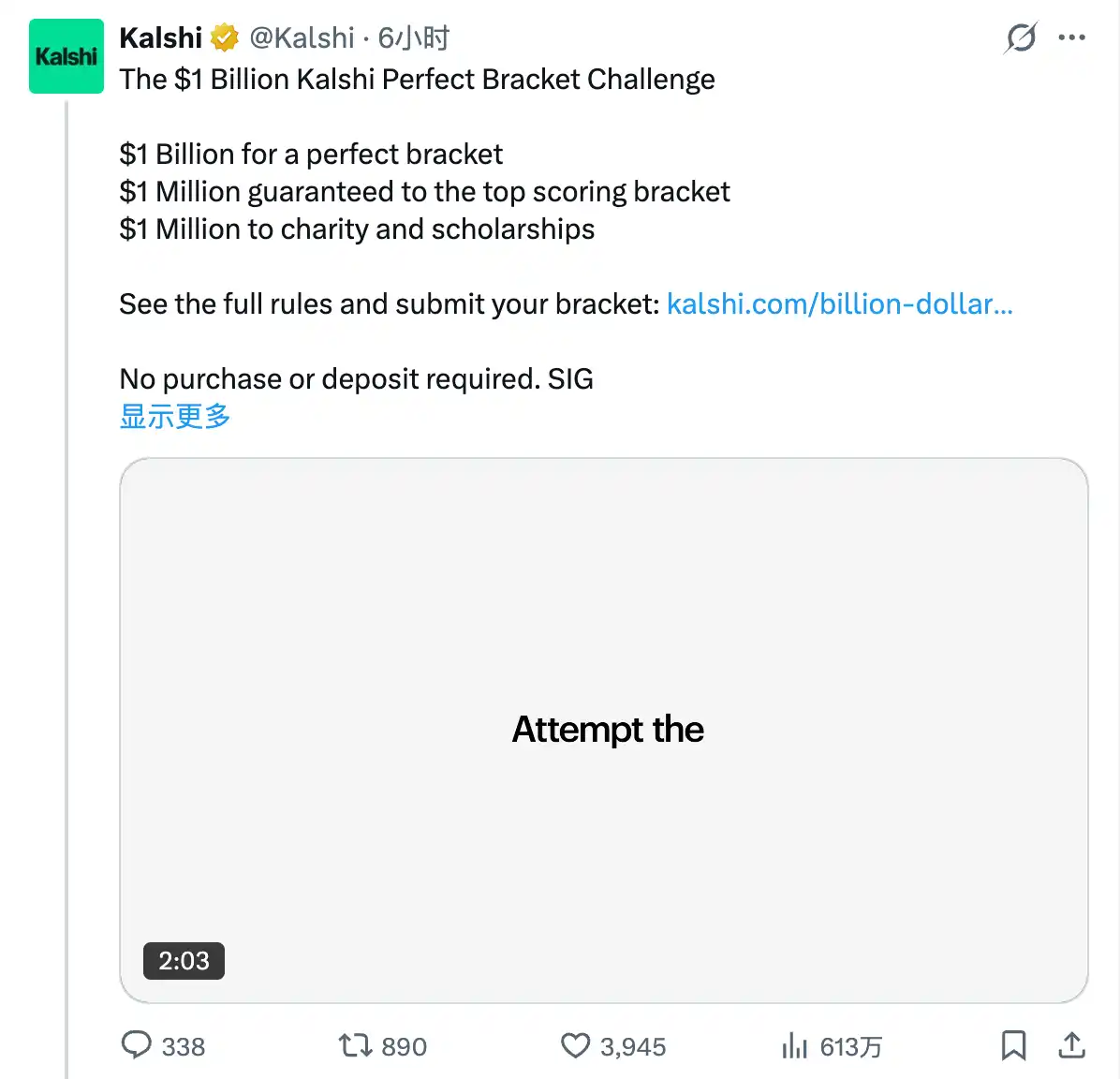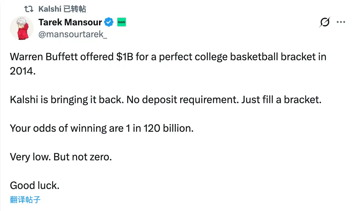 On the early morning of March 17, the prediction market Kalshi announced on X that it would follow the example of Warren Buffett by launching a "Perfect Bracket Challenge" for the upcoming NCAA "March Madness" tournament—users who perfectly predict all game outcomes will win a $1 billion grand prize.