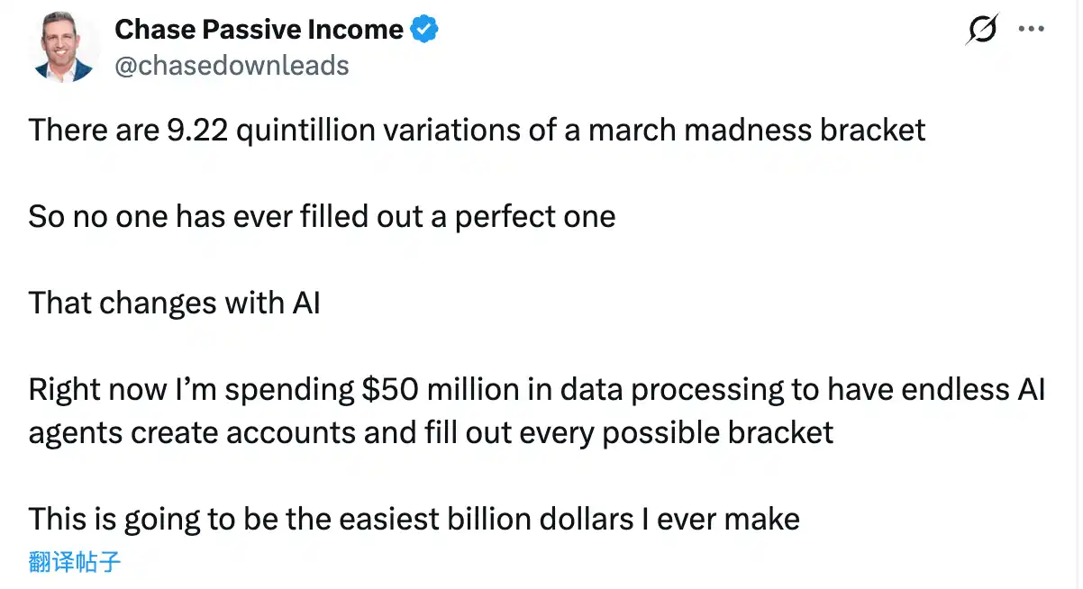 This time, many users are pinning their hopes for breakthrough success on AI—a transformative revolution. Overseas KOL Chase Passive Income posted on X, stating that he plans to spend $50 million on data processing to enable countless AI agents to create accounts and fill out every possible grouping, calling it “the easiest $1 billion to make.”