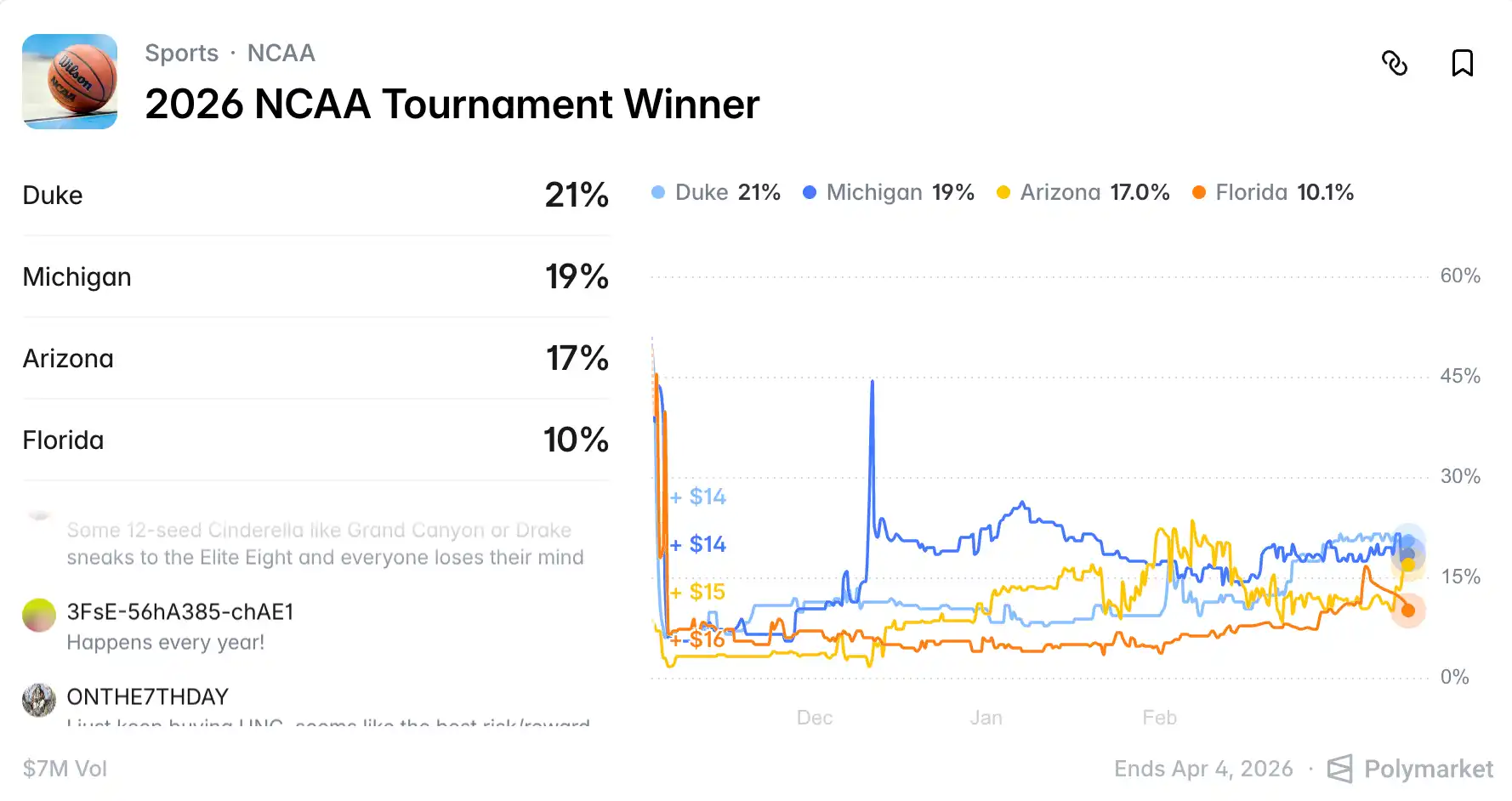 Polymarket's real-time probabilities show that the top four favorites to win "March Madness" are the No. 1 seeds from each of the four major regions: