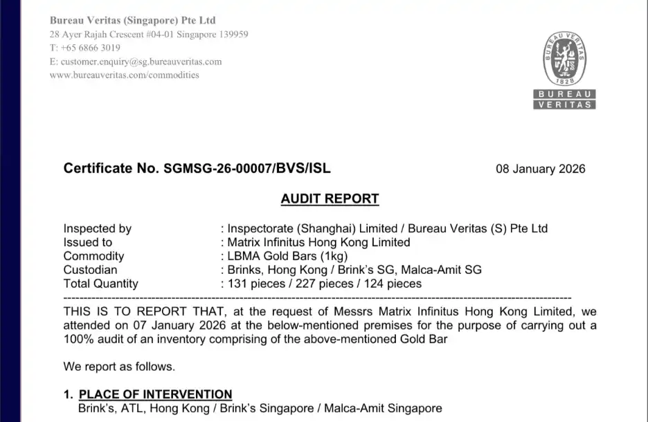Recently, Matrixport's RWA platform, Matrixdock, released its semi-annual physical gold audit report for the second half (H2) of 2025. The report discloses the status of physical gold reserves corresponding to the XAUm token, demonstrating Matrixdock's ongoing commitment to physical asset verification and information transparency.