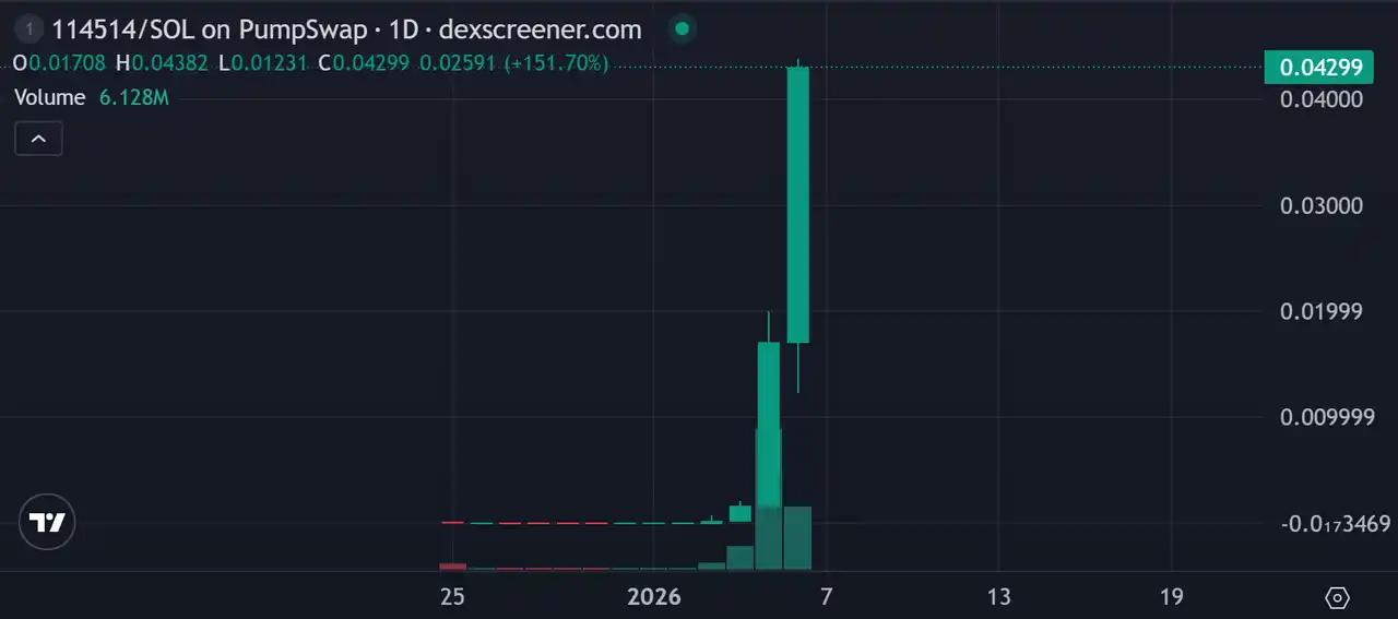 The warming up of the meme market has once again accelerated the rapid rotation of attention. White Whale's success is only over a week old, and its price is still maintaining near historical highs. However, a new "king dog" named "114514" has recently emerged. It just broke through a $40 million market cap to set a new historical record today, surging about 250 times in just two days.