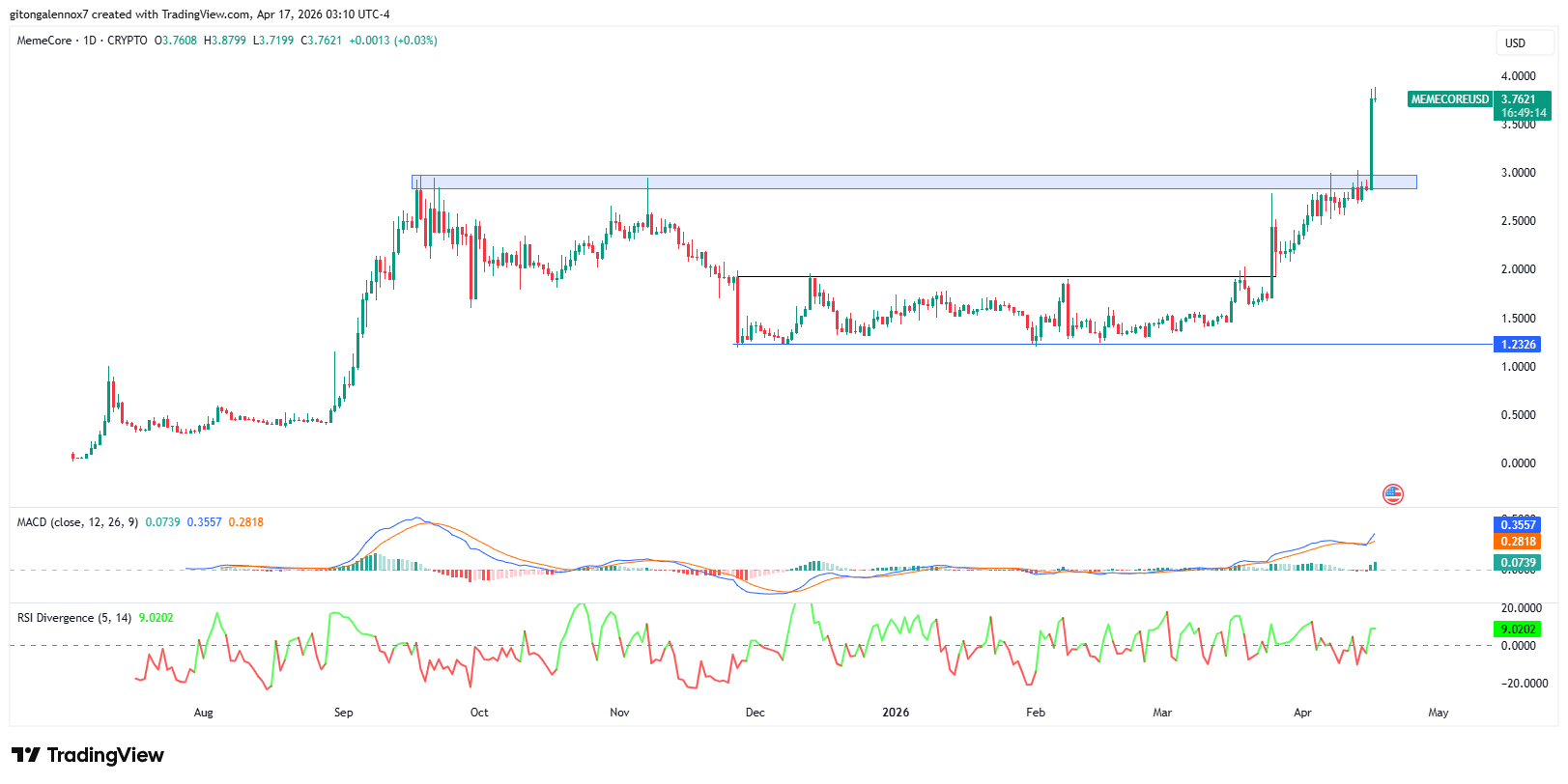 In late March, MemeCore’s price broke out of a sideways consolidation that had held the altcoin since late November 2025. Over the past three weeks, M has been making new daily highs but struggling to break past $3.