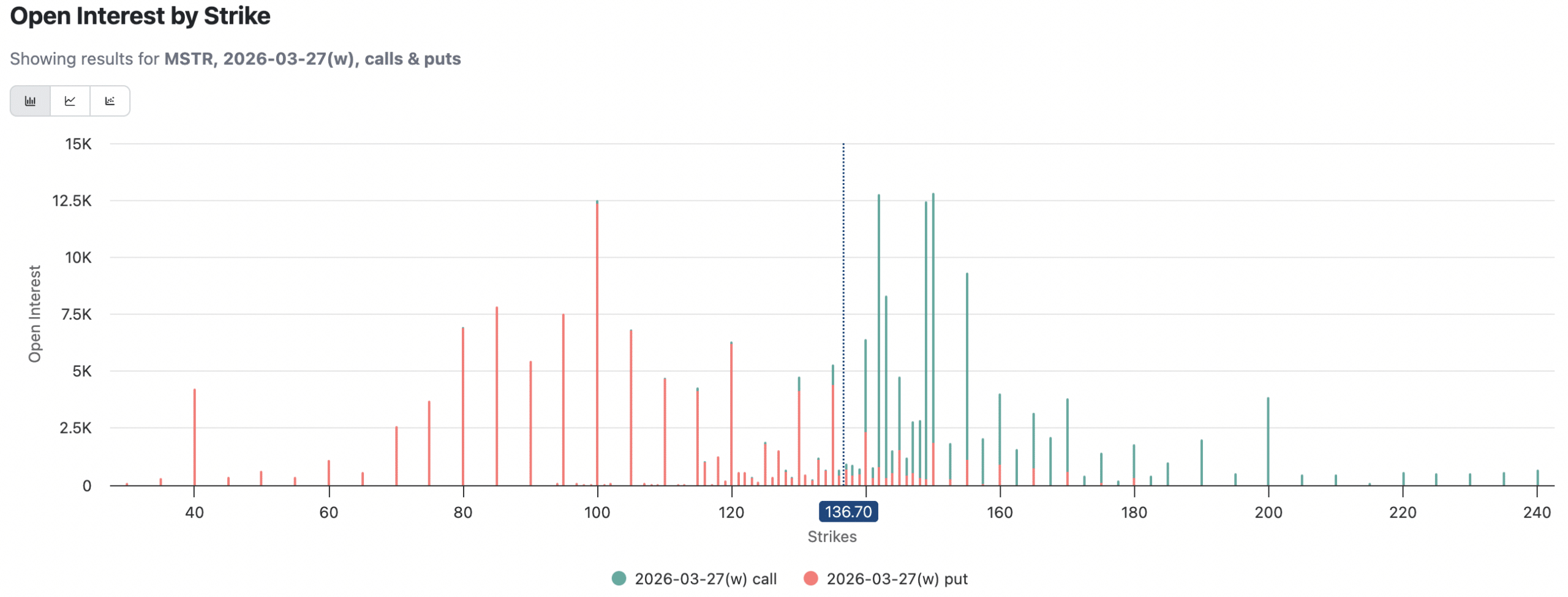 MSTR’s stock is also under slight pressure, trading at $135.66 at press time. However, looking at MSTR stock options, there’s a clear battle happening.