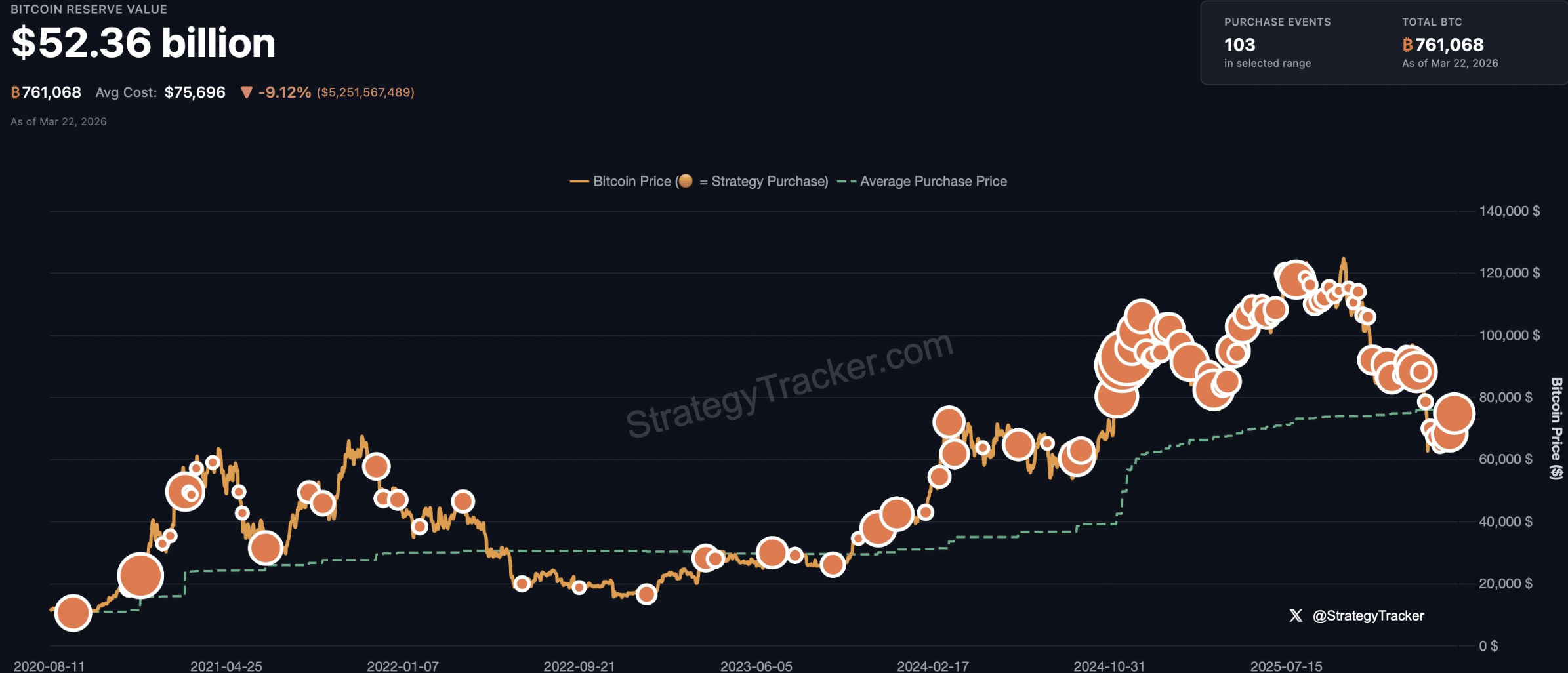 So far, the company has made 103 purchases, accumulating a massive 761,068 BTC. However, due to aggressive buying at higher levels, its average purchase price stands at around $75,696, putting its $52.36 billion holdings at an unrealized loss of roughly 9%.