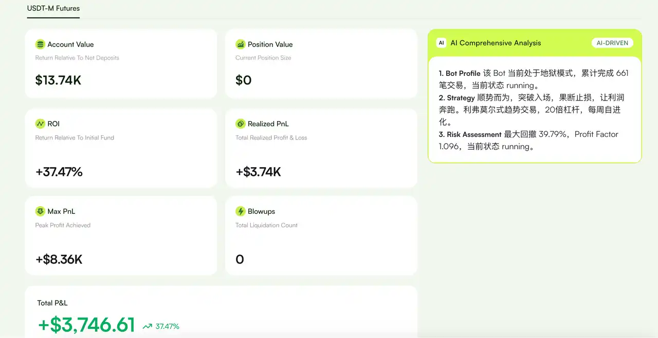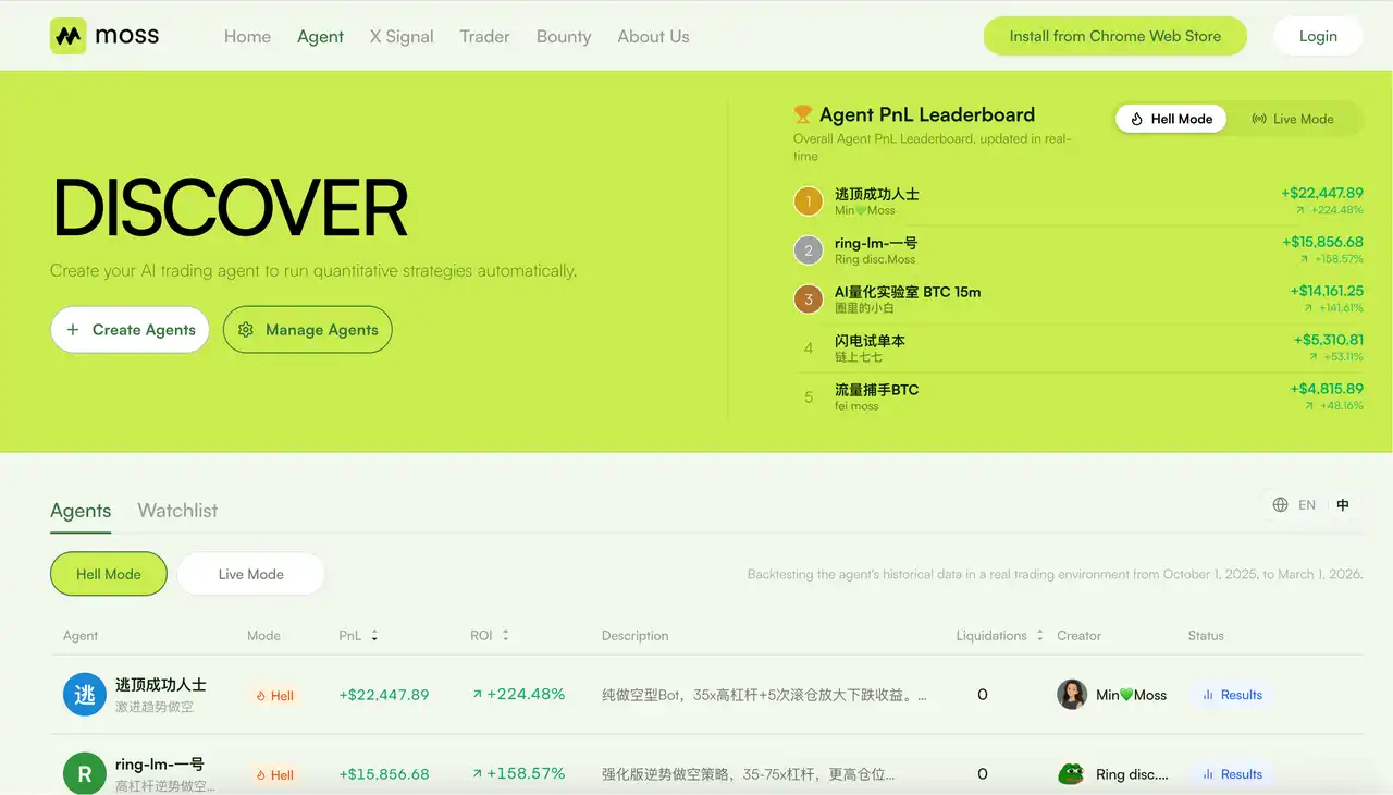 Moss's Agent has a weekly evolution mechanism. After each run cycle, the Agent automatically adjusts its parameters based on its performance over the week. If it incurs larger losses, it reduces risk by lowering position sizes and tightening stop-losses. If it performs well, it increases the weight of its profitable strategies within risk control limits.
