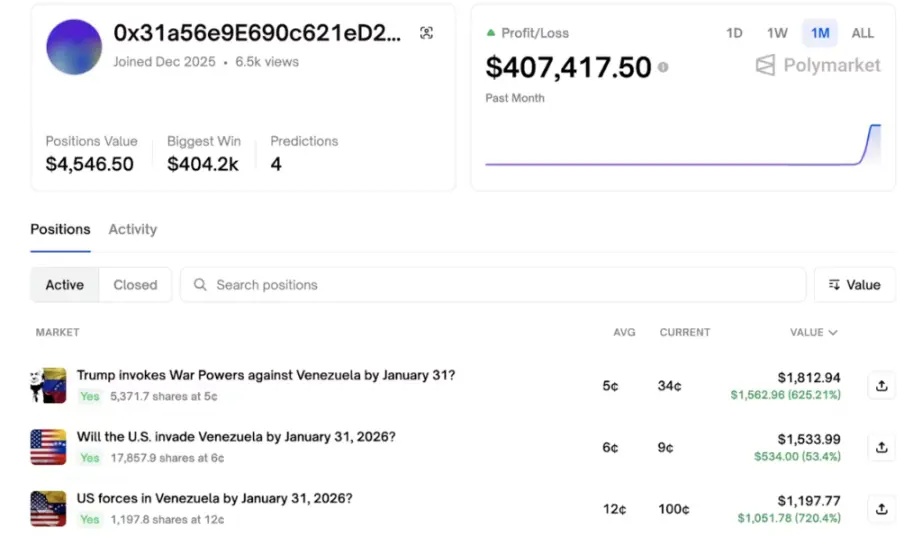 The trading records show that the account heavily built positions on Friday night, several hours before the announcement of the military operation became public. At that time, the market estimated the probability of U.S. intervention in Venezuela to be around 6%. As President Trump confirmed on Saturday morning that the U.S. had captured Maduro, the value of the account's position surged, ultimately generating a profit of $404,222, with a return rate of 1,242%.