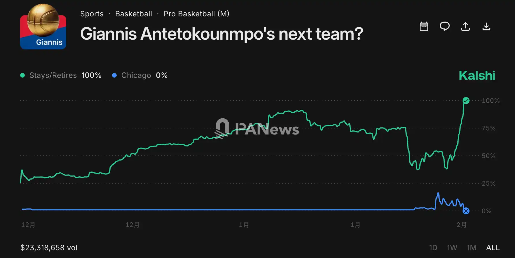 At the same time, event contracts on the prediction market platform Kalshi regarding "Giannis' stay or departure" also began entering the settlement phase. The contract's cumulative trading volume exceeded $23.3 million, making it the NBA's single-event contract with the highest trading volume, aside from the "NBA championship winner."