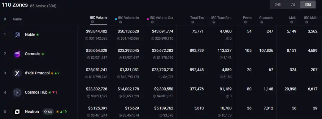 Noble is the only "super giant" in Cosmos. Noble's 30-day IBC trading volume reached $93.84 million, which is 1.8 times that of the second-ranked Osmosis ($50.06 million). Among the 110 zones connected via the Cosmos IBC, Noble contributes a fault-level liquidity.