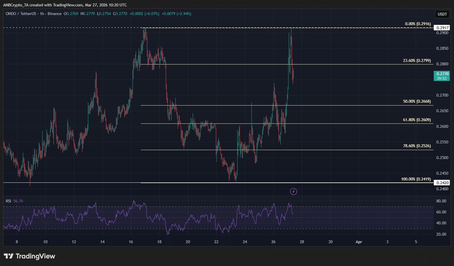 ONDO Finance [ONDO]was trading near $0.277, at the time of writing, after rebounding from the $0.242-level. Around this level, buyers absorbed selling pressure and rebuilt the short-term structure.