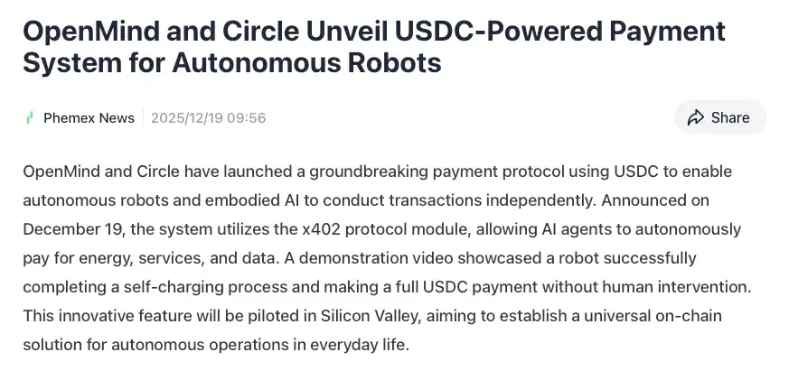 In December 2025, OpenMind, in collaboration with stablecoin issuer Circle, announced the launch of a robot autonomous payment system based on the x402 protocol. As robotic capabilities advance, robots will no longer merely serve as tools for executing tasks but will begin to assume roles within autonomous economies. They will need to purchase computing power, data, and skills, and even hire other robots or humans to accomplish complex tasks.