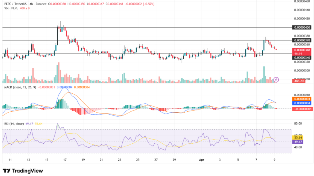 - Key price levels between $0.00000340 support and $0.00000370 resistance define direction, with breakout or breakdown likely shaping Pepe’s next market move.