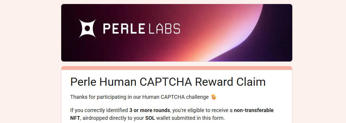 STEP 2. After completing all tasks in the "Marketplace," reply with the specified content to the corresponding Perle Labs tweet, then visit your X platform reply page to verify your answers. You must answer correctly at least 3 times and upload screenshots (ensure each screenshot clearly shows your X username, reply date, and answer). The NFT will be airdropped to the Solana network address submitted in the form. The submission window closes on March 8. (Form link: https://docs.google.com/forms/d/e/1FAIpQLSd7m8YgMSf8TxeC7TqJ8SzBIbZosXKWpyEsjbrKTH5pW3UGLQ/viewform?pli=1)