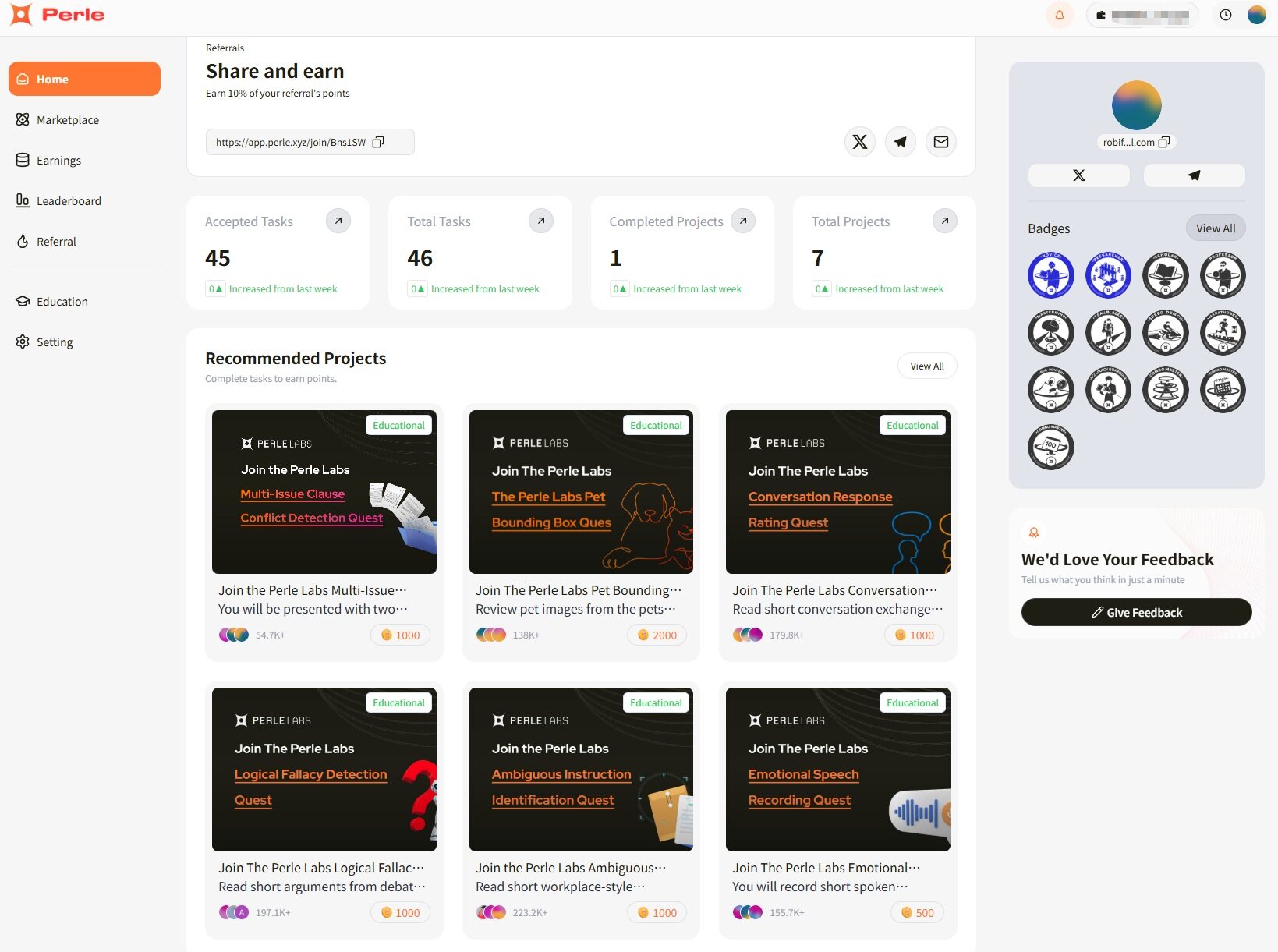 STEP 1. After visiting the official website (link: https://app.perle.xyz/), click “Connect Wallet” to connect a wallet that supports the Solana network (there is a personal referral link; inviting friends earns you 10% of the points your friends earn). Ensure your wallet has a small amount of SOL, as each task requires on-chain confirmation.